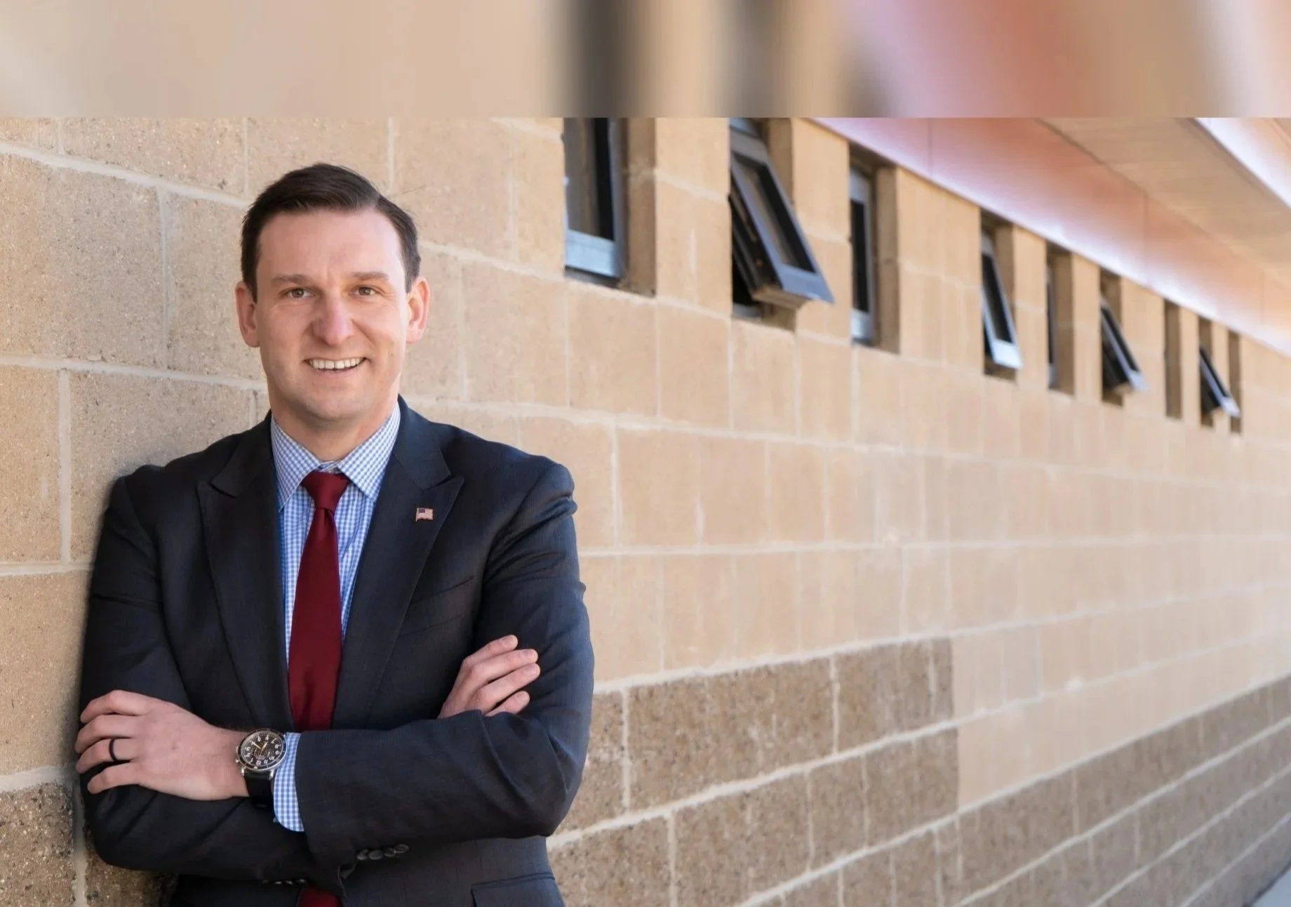 A man in a dark suit with a red tie, standing with arms crossed and smiling, leaning against a brick wall with small windows.